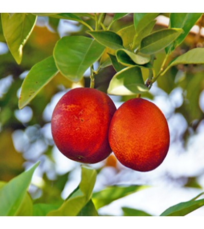 Description: Citrus sinensis is a middle-sized evergreen tree, covered with bark of a greenish-brown color, having auxiliary spines on the branches. The leaves are alternate, ovate-oblong, acute, shining green, the stalk more or less winged. The blood orange has streaks of red in the fruit, and when squeezed the juice is often reddish.