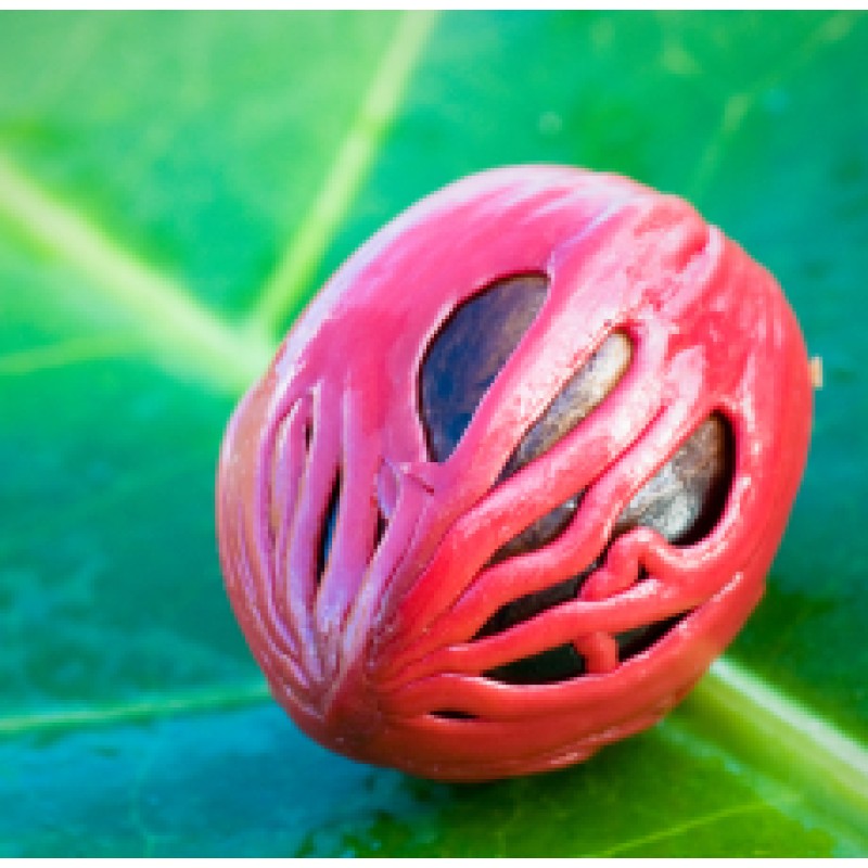The Mace tree may reach heights of about 65 feet (20 metres). They  yield  fruit eight years after sowing, reach their prime in 25 years, and bear fruit for 60 years or longer. The nutmeg fruit is pendulous and  similar  in  presentation  to a peach. When fully mature, it splits in two, exposing a crimson-colored aril. This is the mace which surrounds the nutmeg pit. Mace is a vibrant red-colored seed husk covering (aril).