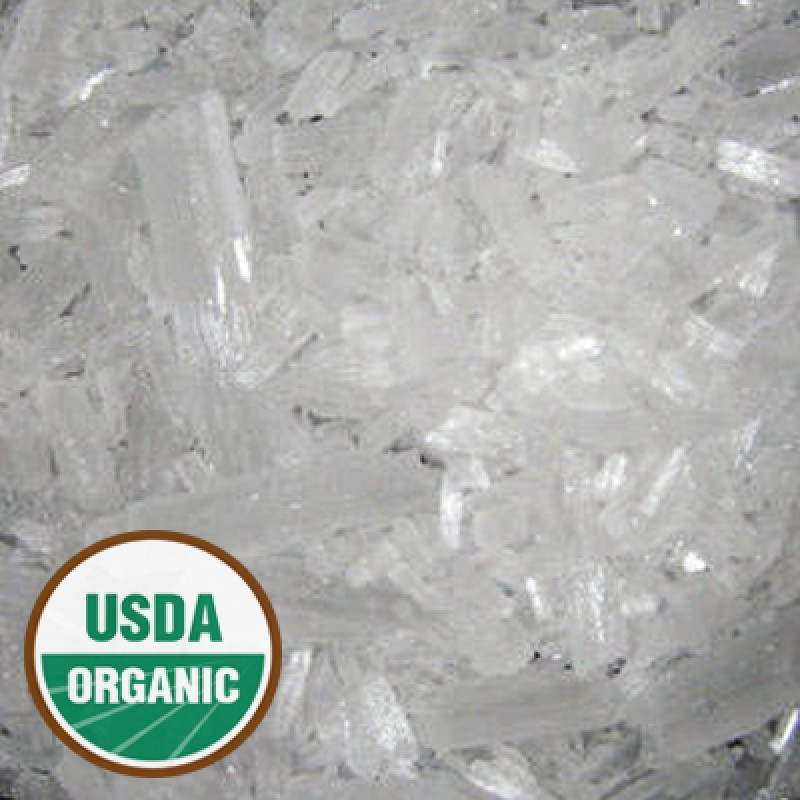Menthol Crystals Organicare naturally obtained from crystallized Organic Mentha Arvensis (Peppermint) Essential Oil, which is derived from the steam distillation of the Peppermint leaves. Menthol crystals are used in a wide variety of cosmetic applications and consumer products such as toothpaste, mouthwash, hair and skin creams, sore throat lozenges, muscle rubs, cooling agents and medicated oils. They can also be used in the soap making industry and will dissolve in oils by lightly heating the crystals. Menthol crystals are solid at room temperature and are popular for their cooling and refreshing attributes, as well as their strong favorable minty aroma. They are soluble in alcohol, but mostly insoluble in water and glycerin. Menthol crystals are very concentrated and only a small amount may be needed in the formulation.