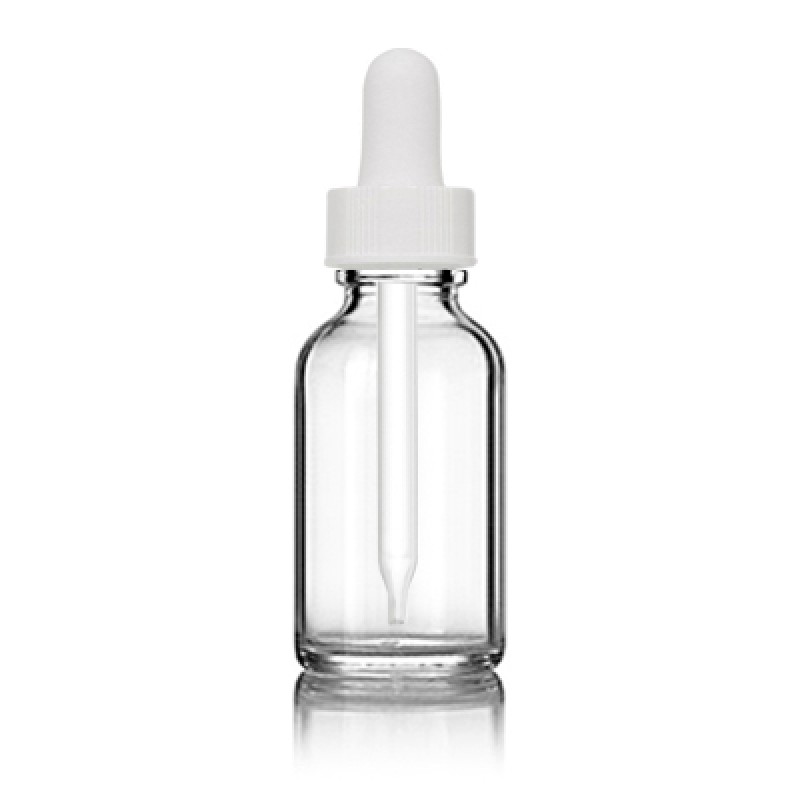 1 oz (30 ml) clear glass boston round bottle with white straight glass bulb droppers. The bulb droppers are used to dispense small amounts of liquid, making these clear glass bottles a great option for packaging products like perfume oils, tinctures and essential oils.