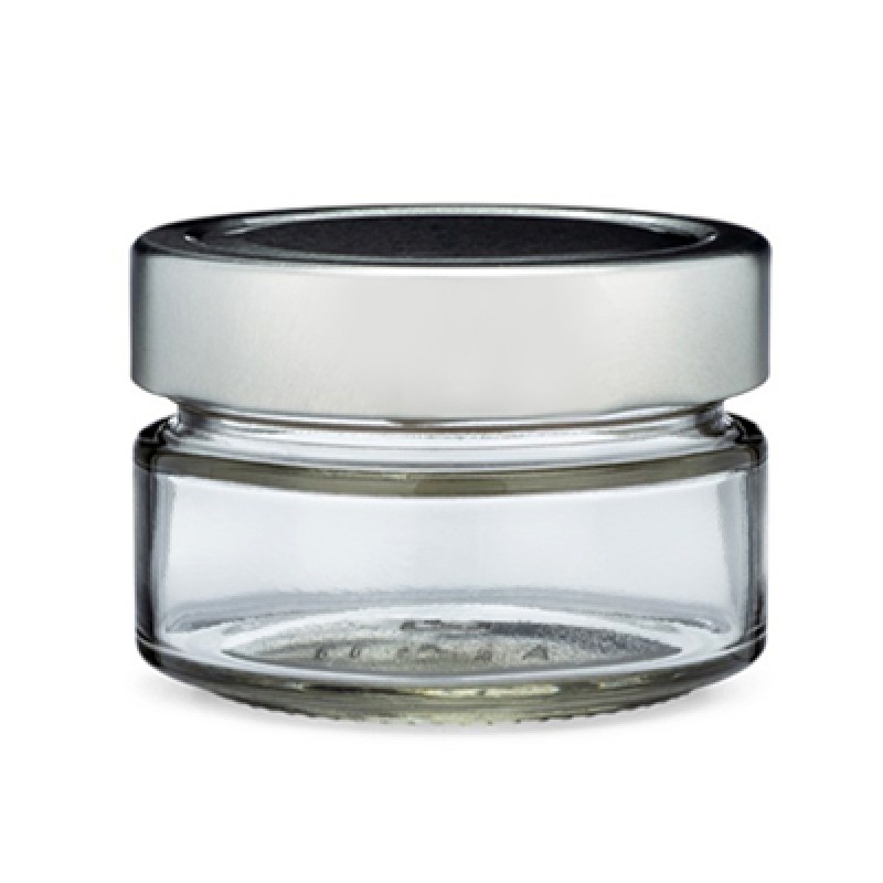 150ml Clear Glass Jar With Silver Cap. These clear glass wide mouth jars come with black metal plastisol lined lug caps. The plastisol liner, when heated and cooled properly, will adhere to the rim of the jar, creating an airtight, tamper evident seal, making this product a good option for canning foods, candles and cosmetics.