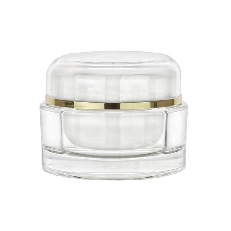 SET, JARS, CAPS, DISC; ACRYLIC JAR, WHITE INNER CAP/BOWL, SILVER RIM 58 MM NECK SIZE.