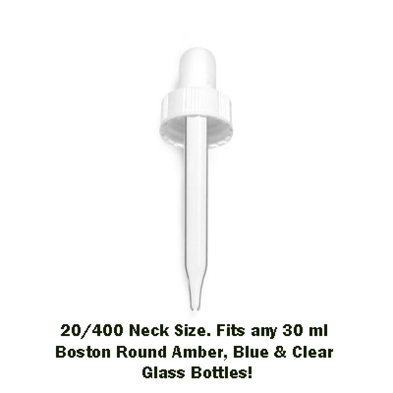 30 ml White Dropper 20/400 The white polypropylene caps with white bulbs and straight glass droppers are available in four cap sizes and pipette lengths. Making an excellent choice to dispense many liquid products, this easy to use glass droppers are a possible choice for cosmetics, perfumes, and essential oils.