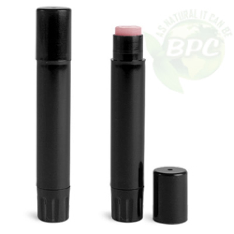 The .07 oz black slim line lip balm tubes are offered here with black caps. A turning wheel at the base of the lip balm tube allows for the lip balm to be neatly dispensed. This natural polypropylene slim stick lip balm tube is 81 mm in height and 12 mm in diameter allowing for an easy to transport lip balm for your purse or pocket. This slim line lip balm may also be useful for other products such as solid perfume sticks, sunscreen, or insect repellants.