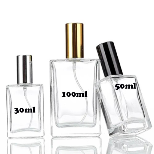 50 ml Glass Perfume Bottle With Sprayer. If you are looking for designer type perfume bottles look no further. High-quality perfume glass bottles with heavy base offering design flexibility and decorative finishes that reflect luxury and elegance. Unique rectangle shape and three sizes 30ml, 50ml and 100ml larger front and back for easy labelling.
