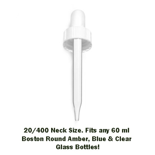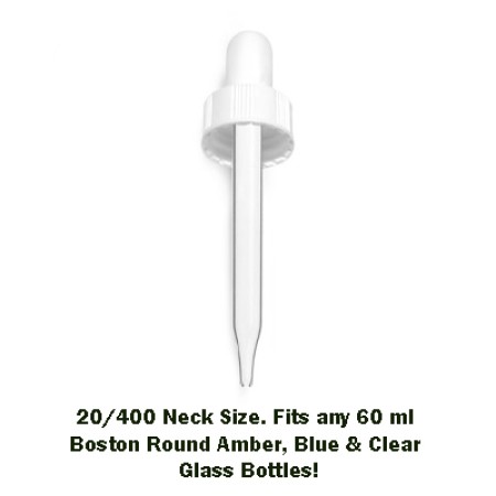 60 ml White Dropper 20/400 Neck Size. The white polypropylene caps with white bulbs and straight glass droppers are available in four cap sizes and pipette lengths. Making an excellent choice to dispense many liquid products, this easy to use glass droppers are a possible choice for cosmetics, perfumes, and essential oils.