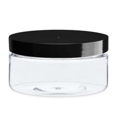 8 Oz Clear Pet Heavy Wall Jar With Black Cap. These jars are available in different styles and colors. They are perfect for storing creams, body butters, balms and much more. 250 ml (8 OZ) HEAVY WALL PET CLEAR JAR 89-400 8 Oz Clear Pet Jar With White Cap. These jars are available in different styles and colors. They are perfect for storing creams, body butters, balms and much more.
