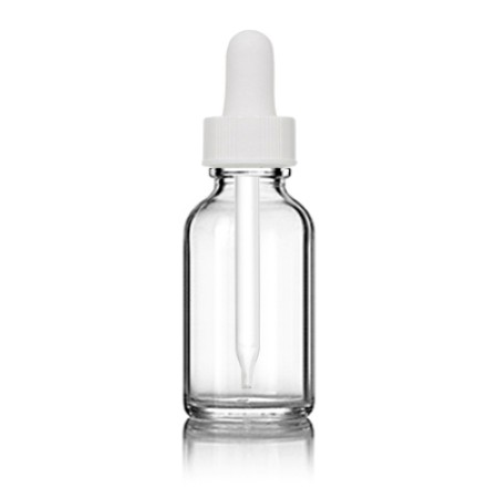 1 oz (30 ml) clear glass boston round bottle with white straight glass bulb droppers. The bulb droppers are used to dispense small amounts of liquid, making these clear glass bottles a great option for packaging products like perfume oils, tinctures and essential oils.